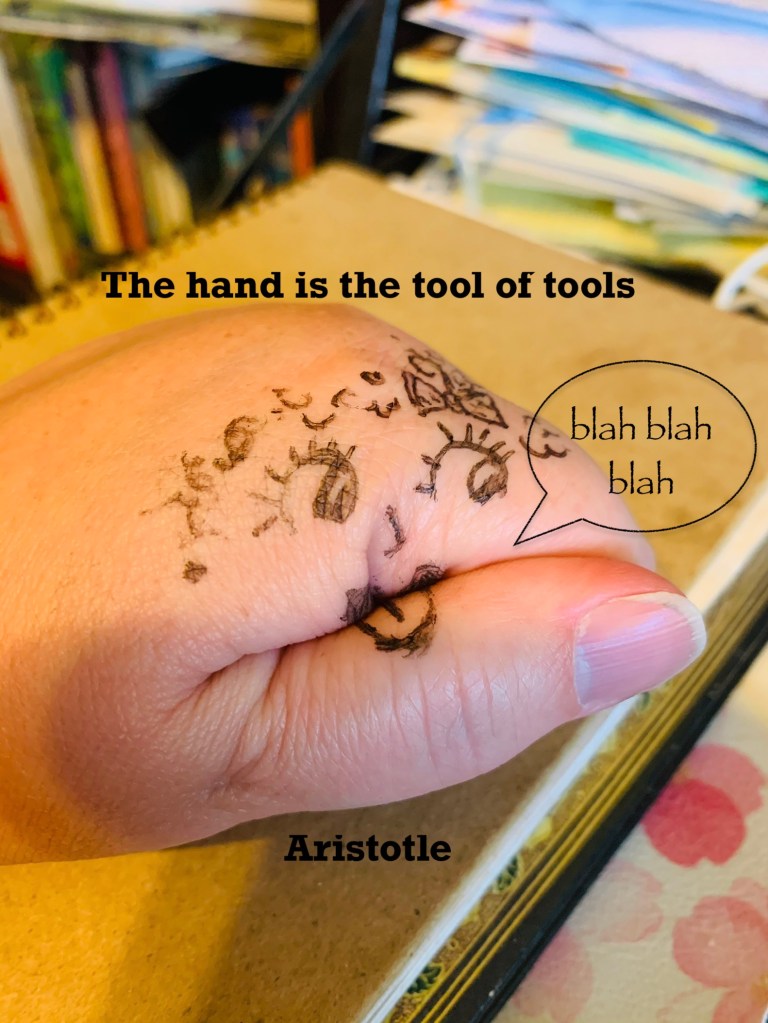 The Blah Blah’s come alive when you make your hand into a fist with a straight thumb, wiggling your thumb up and down to make the Blah Blahs talk. We like to draw side knuckle eyes, nose, and a great gloppy tongue hanging out of their mouth. Occasionally the tongue gets so big that all they can say is, “blah, blah, blah.” Hence the name, the Blah Blahs. FriendEHerisme has been talking to, playing with, and feeding the Blah Blah’s (they eat the pens that drew them! How nervy!) since she was a teeny tiny human (as has SonHerisme, NiecesHerisme… and others).